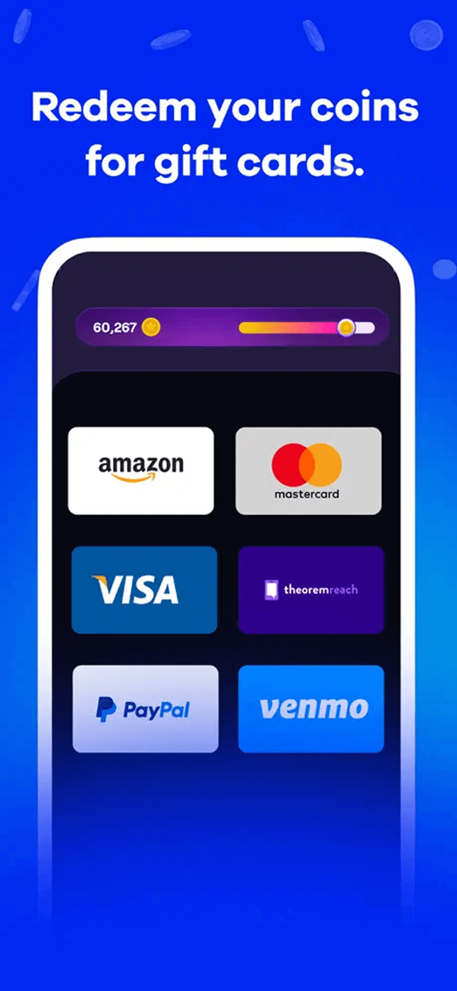 Turn gold coins into Amazon, PayPal, Visa, and Mastercard gift cards. Whether you're completing tasks or answering surveys, the swag is just a few taps away. It's way easier than scanning receipts or clipping coupons!